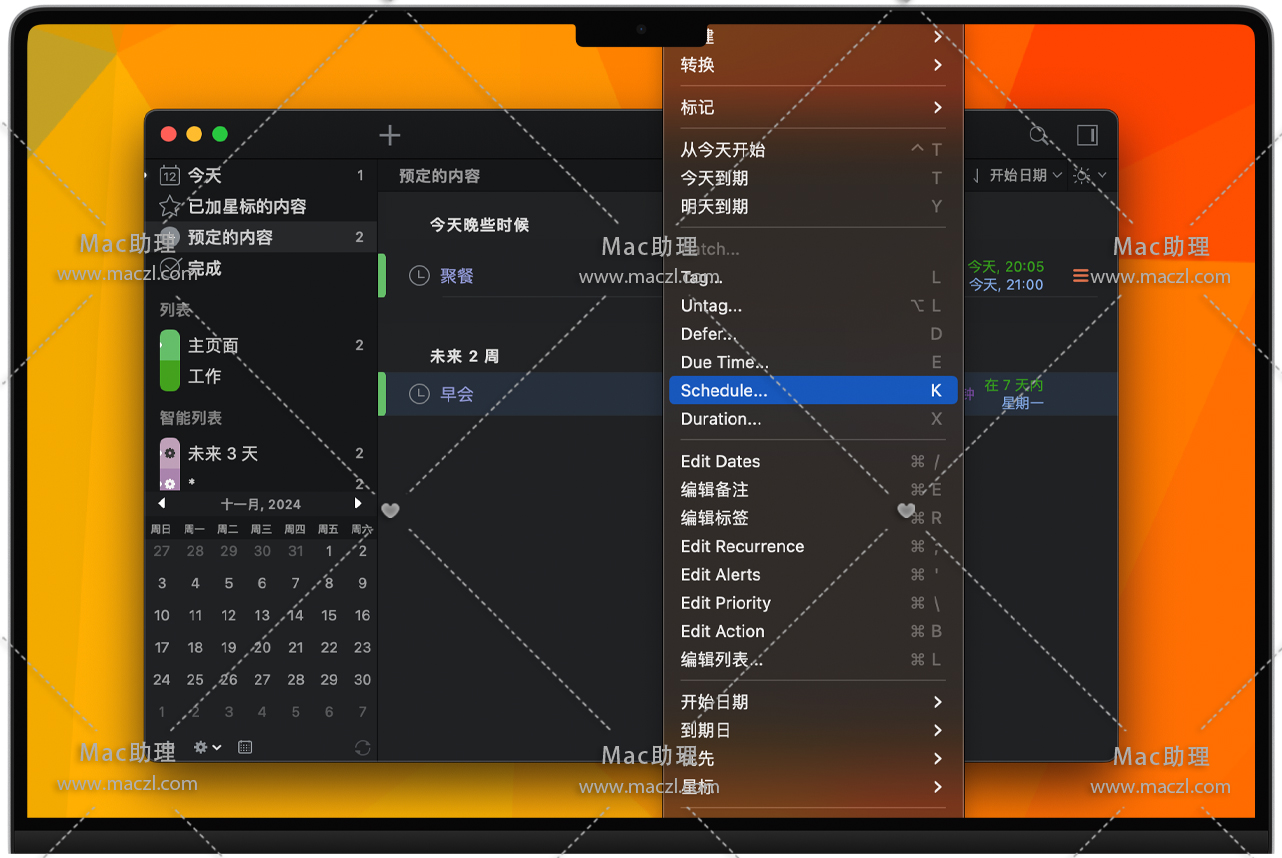 随意忘记检查您的日历。借助这款 Mac 任务管理器的通知功能,您可以在输入任何任务时安排提醒,当时间到时,即使主窗口未打开,应用也会弹出桌面通知。对于不能错过的事件,音频警报将被证明是必不可少的。