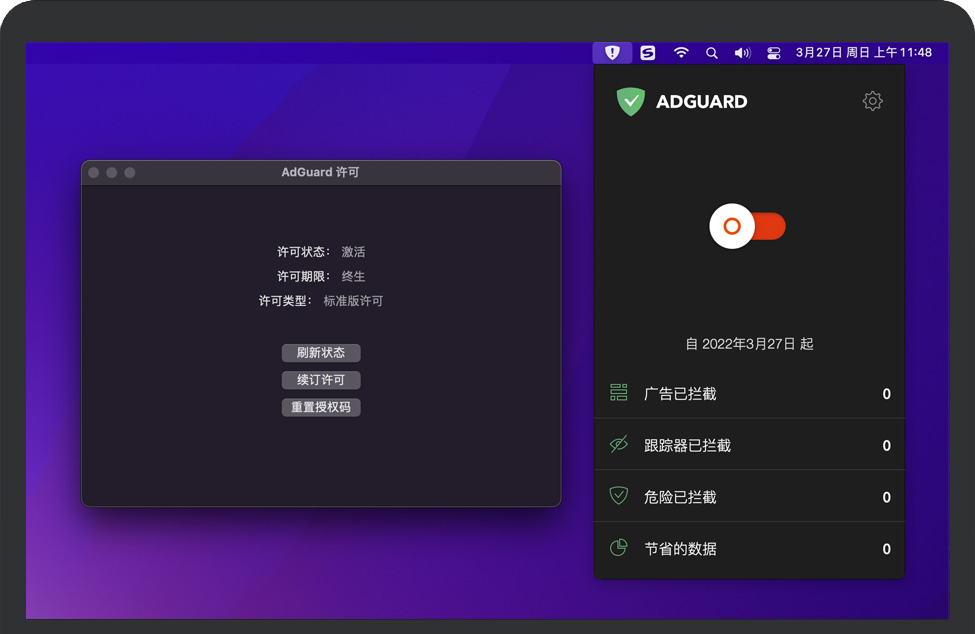 浏览器AdGuard“拦截”你的浏览器的流量,并通过自己的过滤引擎引导它。在Chrome, 火狐或任何一款你喜欢的浏览器里 —— 你不需要安装任何特定的扩展来拦截广告。AdGuard程序可过滤任何浏览器的广告。(不过,你可能会想额外安装AdGuard浏览器助手 —— 一款桌面应用的一个小扩展,它可以帮你正确地管理浏览器中的过滤过程)。 | 网络过滤AdGuard需要在网络层面工作来控制你设备上的所有应用程序。为此,我们使用一种特殊的网络驱动程序,它能激活网络上数据的实际传输和接收。 | |
