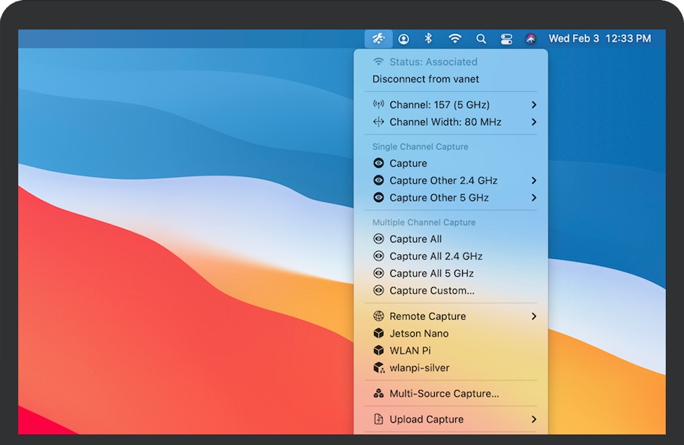 您还可以使用 Airtool 使用功能强大的 Linux 机器和兼容的 Wi-Fi 适配器(例如WLAN Pi)进行远程 Wi-Fi 数据包捕获。