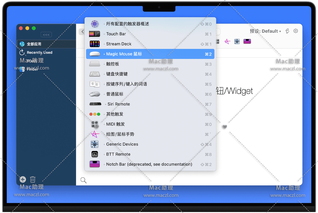 BetterTouchTool 最独特的功能在于它支持多种输入设备。您可以使用 MacBook 触控板、妙控板、妙控鼠标、普通鼠标、键盘、触控栏、iPhone 或 iPad(需搭配 BTT Remote),以及 Siri 和 Apple Remote 来精确触发您想要的操作。