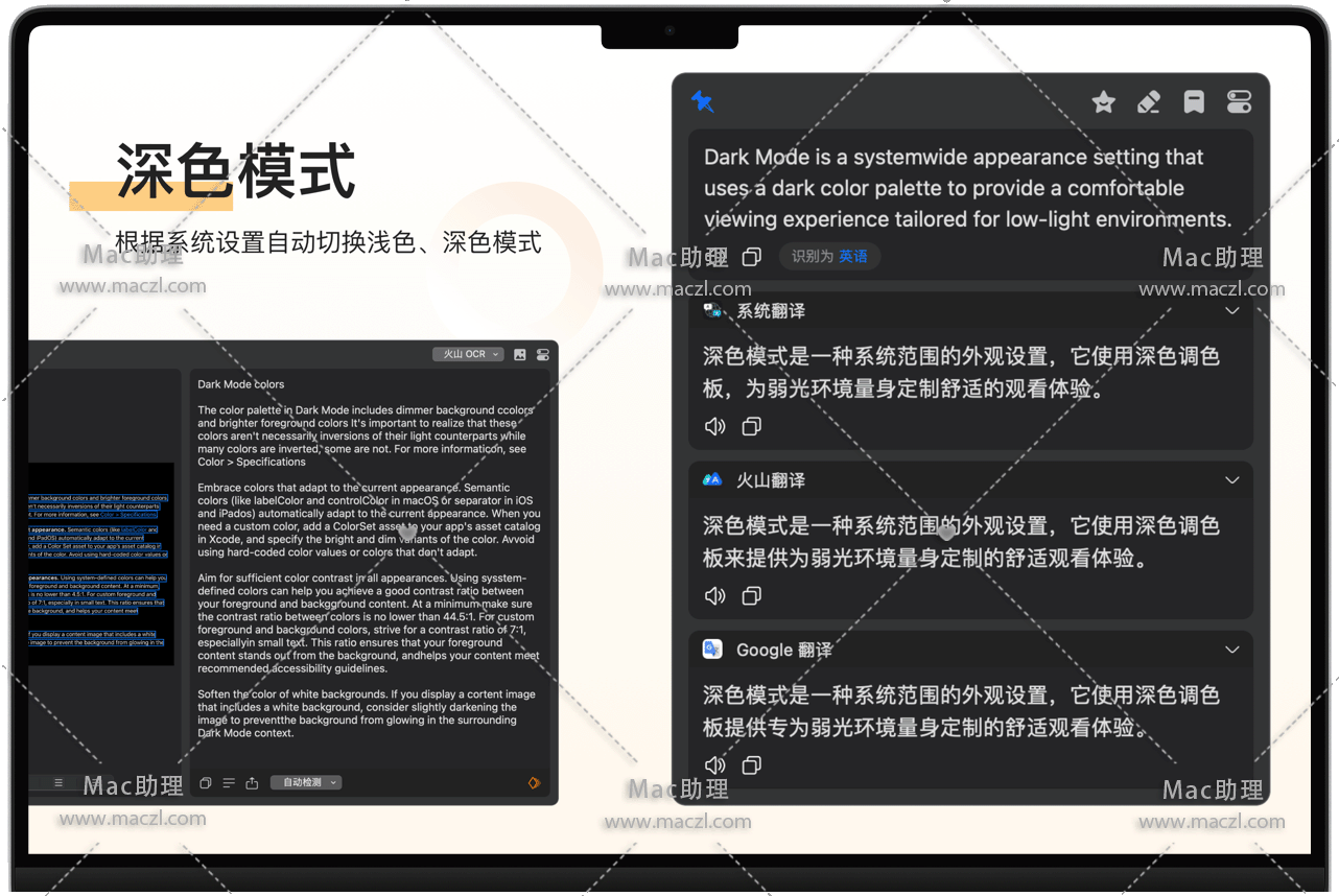 - 截图翻译:按下截图翻译快捷键(默认 ⌥ + S),截取需要翻译的区域即可翻译