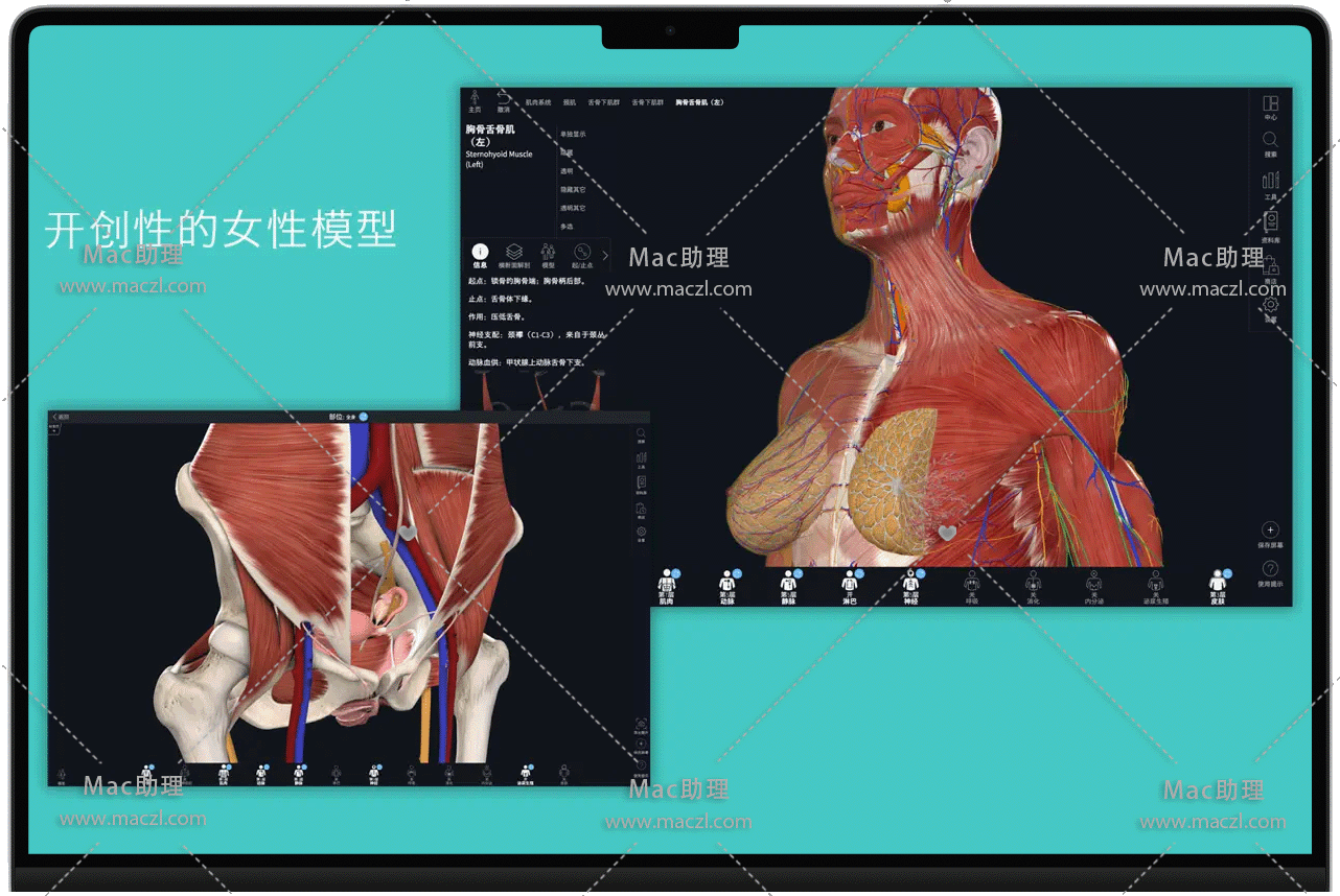 动态断面解剖、实时肌肉运动、肌肉起止点、骨表面和骨性标志、12个分层人体系统、神经示踪、血供示踪