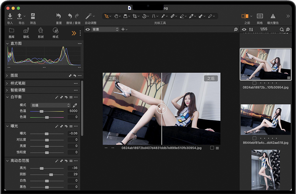 通过智能调整大幅缩短编辑时间。 通过自动调整曝光和白平衡,为在不同光线条件下拍摄的照片打造相似的效果 - 针对肖像、婚礼或其他人物拍摄工作进行了优化。