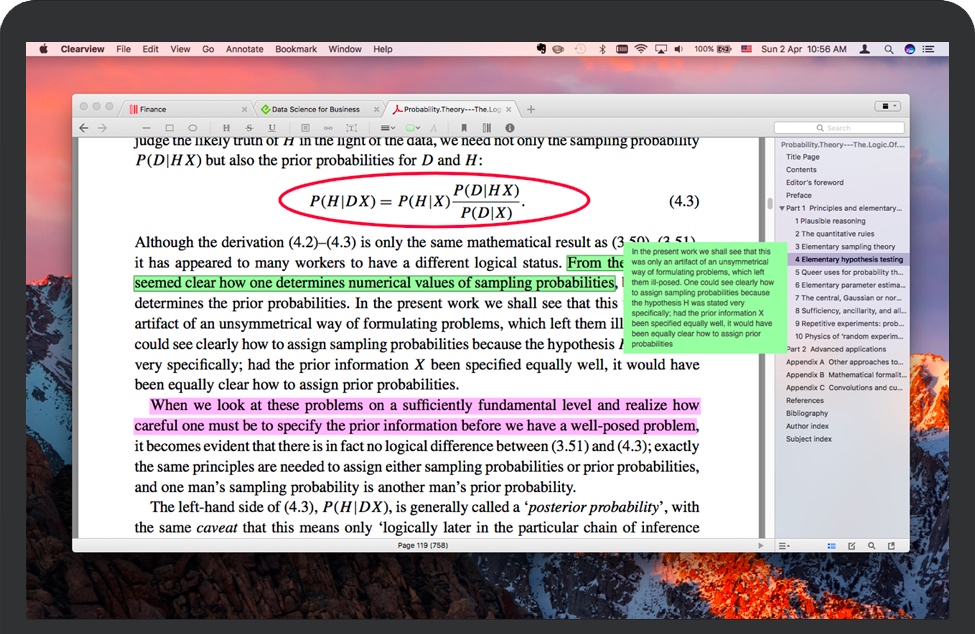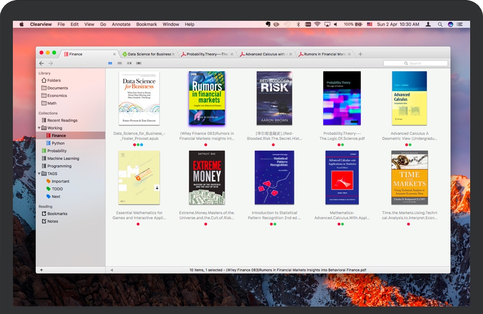 Clearview for Mac 是一款标签式电子书阅读器,支持流行的电子书格式,如PDF,EPUB(无DRM),CHM和MOBI格式阅读。标签页浏览外观,直观好用的图书管理功能,支持 PDF, Epub, MOBI, CHM, FB2, CBR, CBZ 等流行的电子书格式,可以方便地添加注解,插入书签,及迅速的搜索查找。支持在不同 Mac 之间同步注解/笔记,书签和选集。