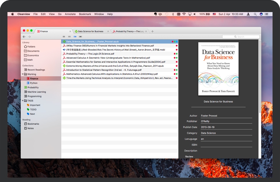 只需把存放图书文件的文件夹从 Finder 中拖拽到 Clearview 的书架,图书文件信息将被迅速导入,然后您就可以方便地浏览,搜索,组织,和阅读图书了。通过图书文件夹和阅读列表结合的方式来管理图书,一切都变得简单起来。