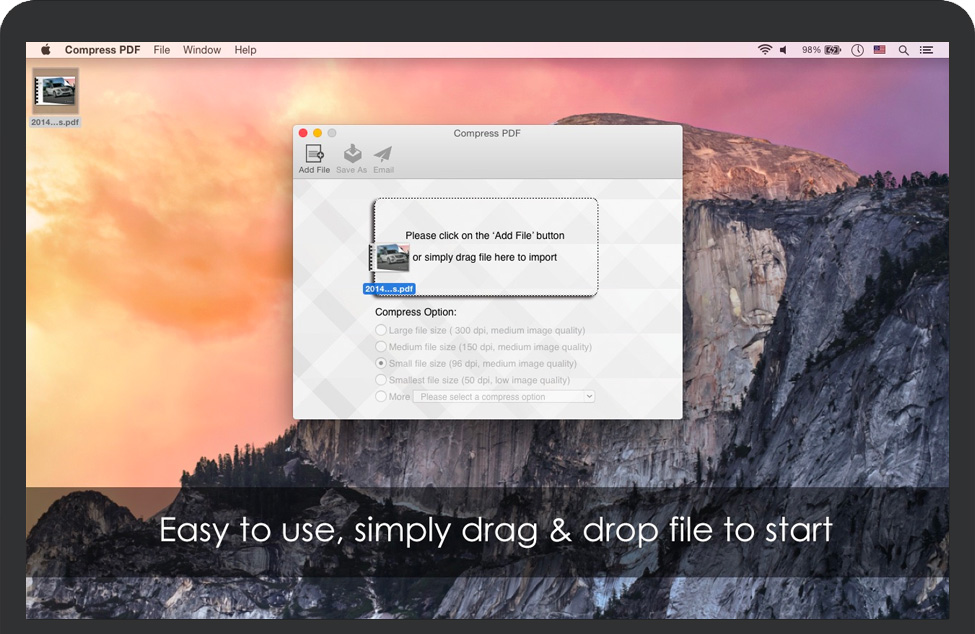 启动 Compress PDF for Mac,将 PDF 文件拖放到文件区域。
