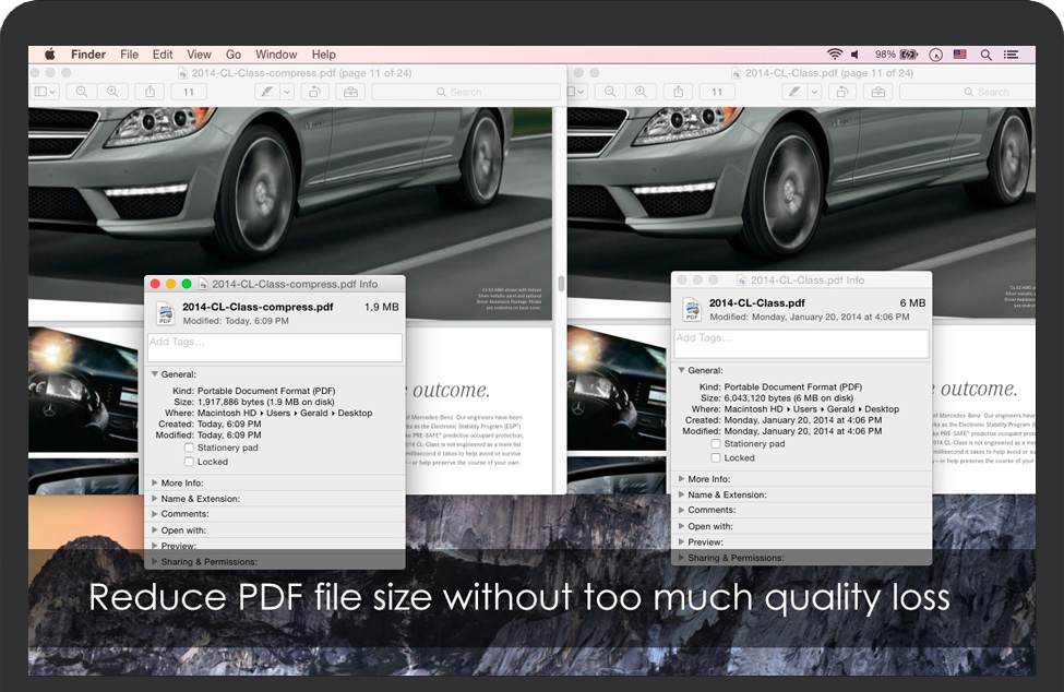 Compress PDF for Mac是一款简单实用的应用程序,可帮助您快速缩小 PDF 文件,尤其适用于包含大量图形和照片的PDF文件。它主要通过降低图像的dpi和图形质量,并删除不必要的数据来减小PDF文件的大小。