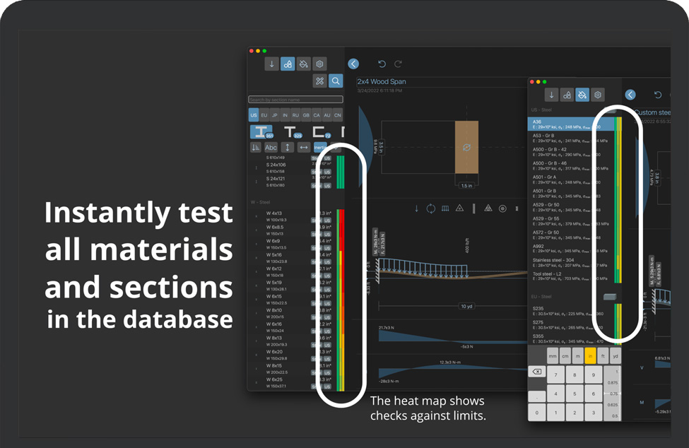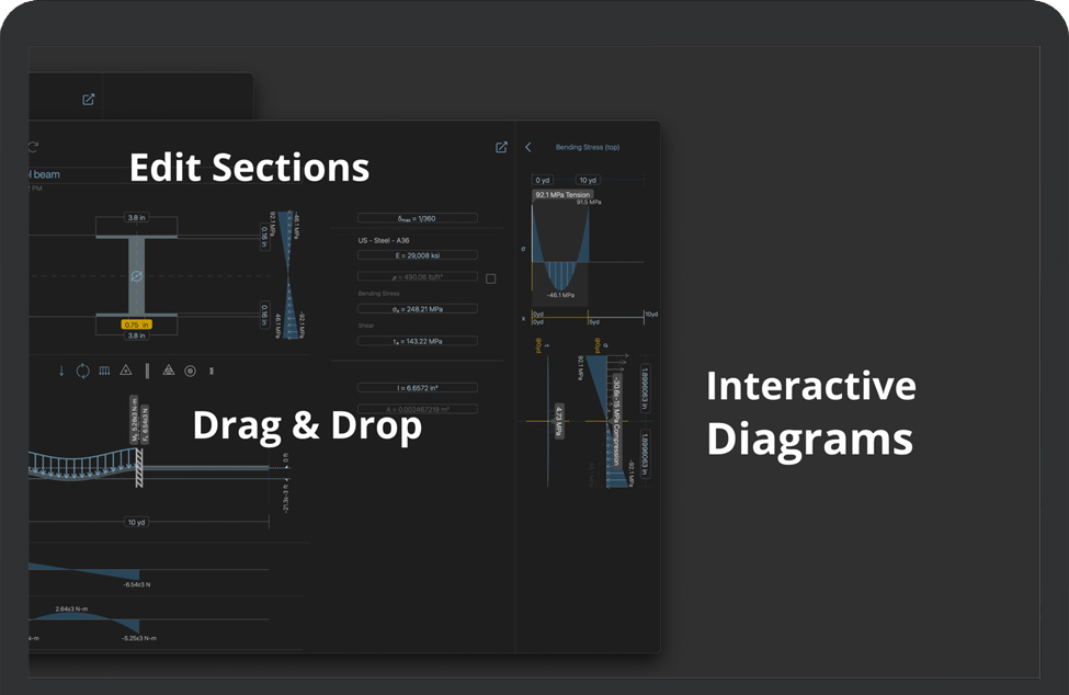 只需将负载和支撑放在梁上,然后看它如何弯曲。在内置库中找到横截面,或定义自定义形状。挠度,内部应力和其他有用的结果会自动更新。