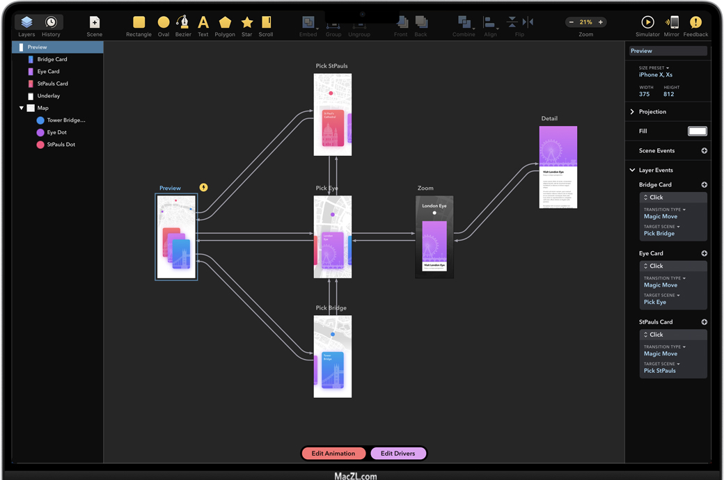 Drama for Mac 是一款集成动画和原型设计的软件。动画和原型设计独特地集成到一个熟悉的工具中。不再需要在应用程序之间切换或学习新东西。通过提供Magic Move,Time Travel,3D图层,驱动程序和Magic Drag等高级功能,Drama真正成为满足您设计需求的一站式解决方案。