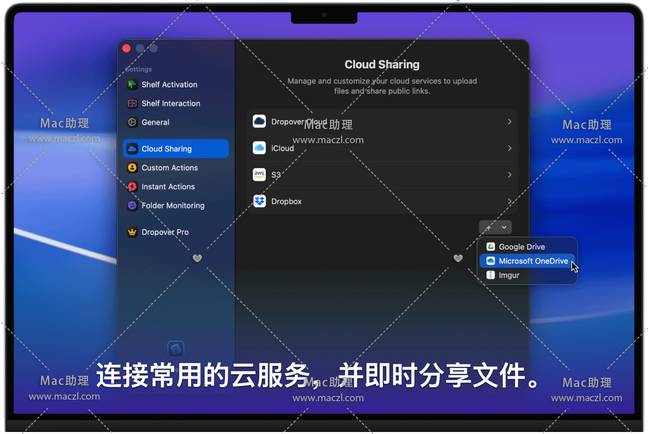 上传内容只需单击一下即可上传拖拽的文件,并直接从文件架复制公共链接。 Dropover 内置云服务,此外还支持 iCloud Drive、AWS S3、Google Drive、Microsoft OneDrive 和 Imgur。