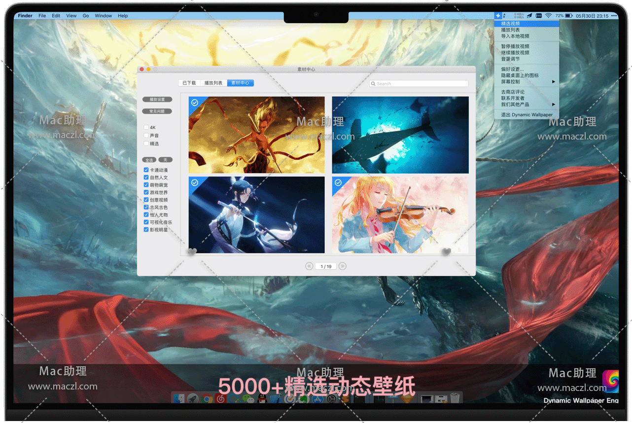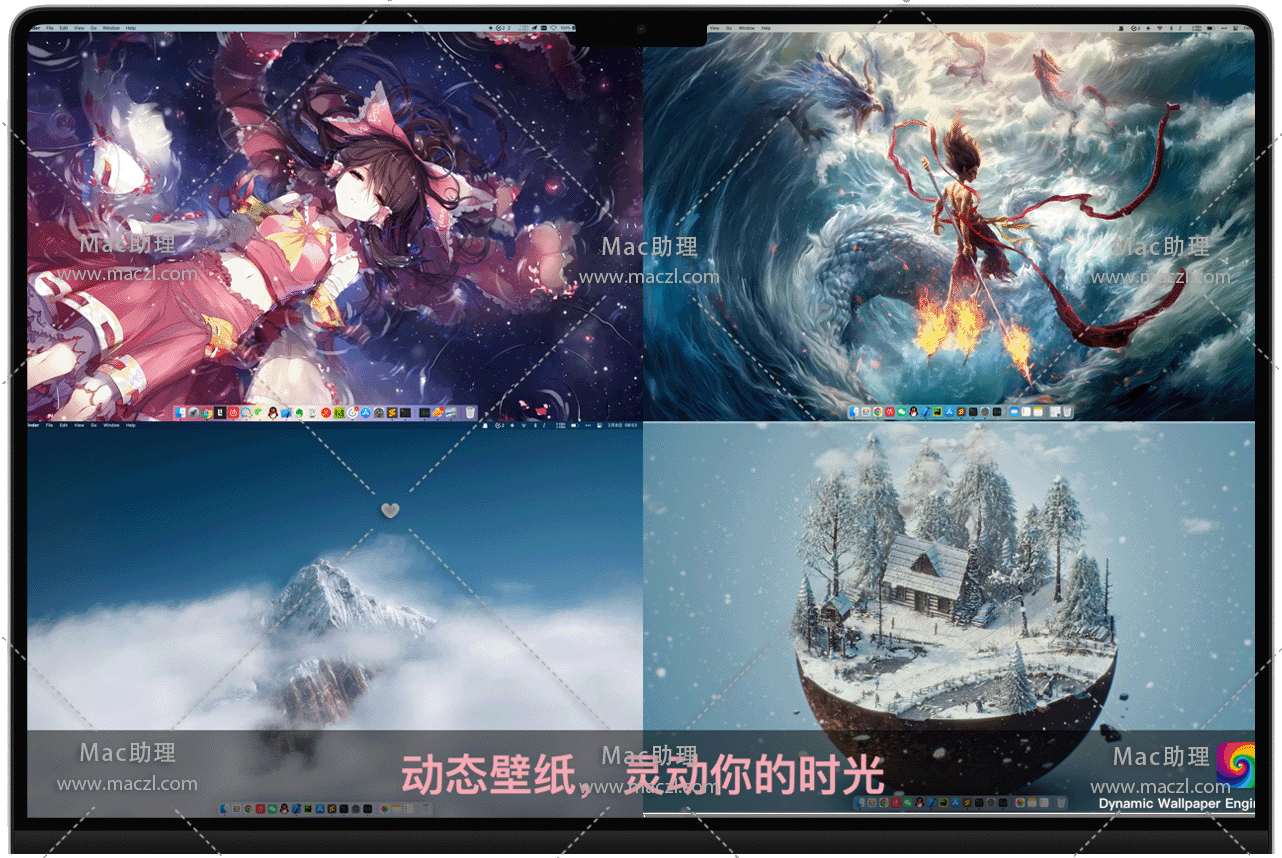 Dynamic Wallpaper Engine for Mac 是一款适用于苹果电脑的视频动态壁纸,告别单调的静态壁纸,拥抱活泼的动态壁纸。内置在线视频素材库,同时占用尽可能少的系统资源。一键下载应用,也可导入本地视频,同时可以将视频设置为您的电脑屏保。Dynamic Wallpaper允许您在桌面/屏幕保护程序上使用实时壁纸。