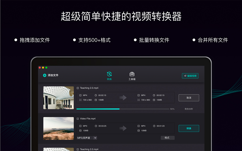 视频到音频转换器音频转MP3 / WAV / AAC / FLAC转换器视频编辑器-编辑视频多样的输出设置易于使用的视频转换器直观简洁的界面 直接拖放文件 自定义输出文件夹 一键转换和编辑文件
