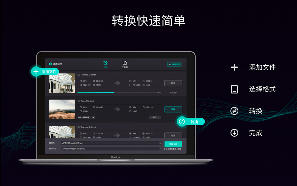 Filmage Converter 视频转换器也支持从视频中提取音频,音频转音频,编辑视频,剪辑,裁剪视频等等。 Filmage Converter 完全不含广告,无干扰视频转换,高效快速。 主要特点任何视频格式转换器将视频转换为流行的视频格式 将任何视频转换为 MP4、MOV、3GP、VOB、MKV、M4V、WMV、AVI、MPG、FLV、F4V、SWF、TS等任何视频格式 支持针对Apple TV、iPad、iPhone、iPod、Xbox 360、PSP、LG、三星、华为、小米、HTC等更多其他媒体播放器,将视频转为兼容格式,轻松播放视频 将视频转换为动画GIF(GIF Maker) 您可以转换录制的视频、下载的视频、用摄像机拍摄的视频等任何视频,添加到 Filmage Converter 转换列表中,一键同时转换。让您的视频与所需的视频播放器兼容 一键视频格式转换器让您批量转换所有视频文件 视频合并:将多个视频/音频文件合并为一个新的文件 转换高清和超高清4K视频 拖放文件到视频转换列表,一键转换