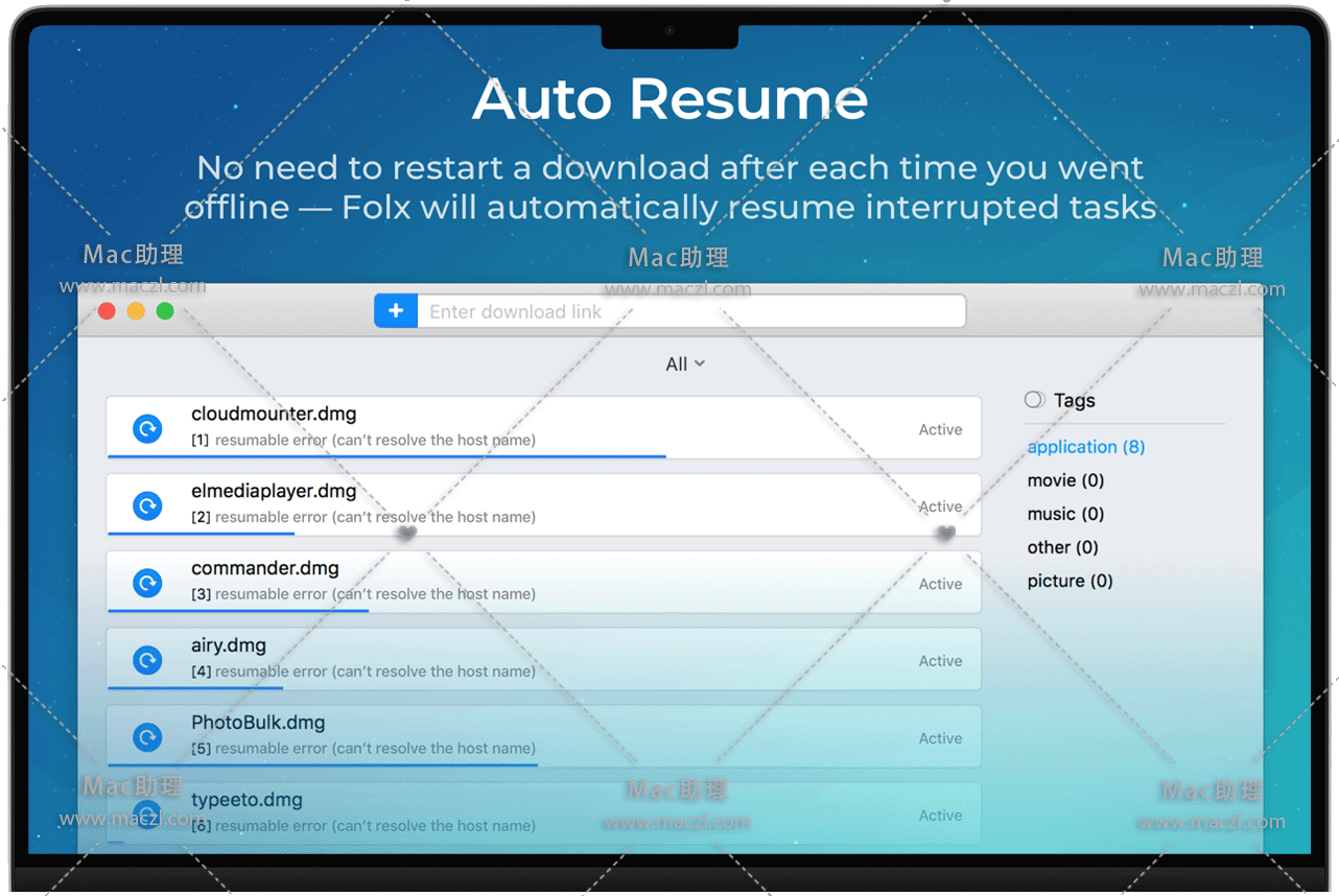 除了从torrent跟踪器中下载文件之外,Folx还使您可以使用磁铁链接进行下载。