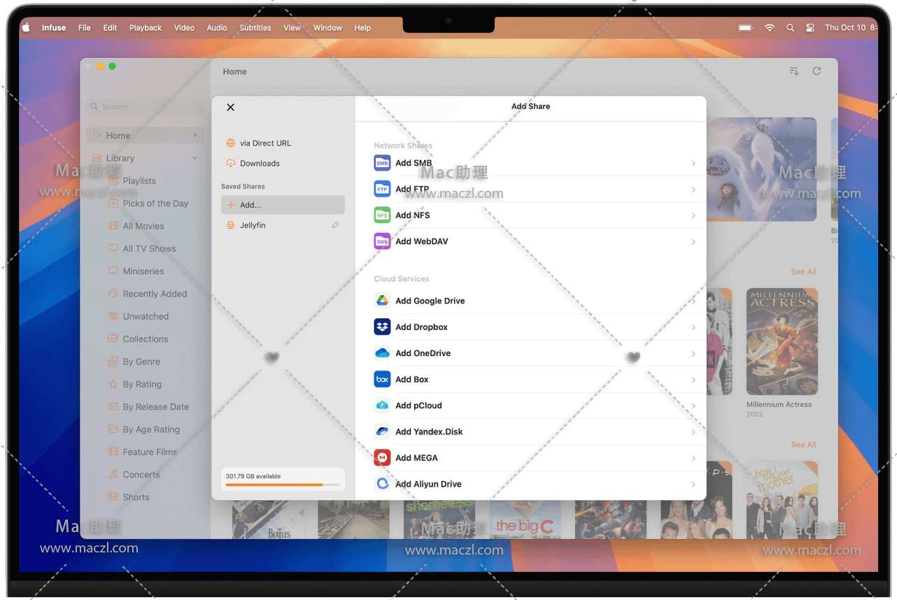 浏览并播放储存在您Mac、PC、NAS、带有Wi-Fi功能的硬盘以及程序如Plex、Emby、Jellyfin和Kodi(XBMC)中的视频。Dropbox、Google Drive、Box、OneDrive、pCloud、Yandex.Disk、MEGA、阿里云盘、123 云盘、115 网盘和百度网盘也支持喔 —— 无需同步。