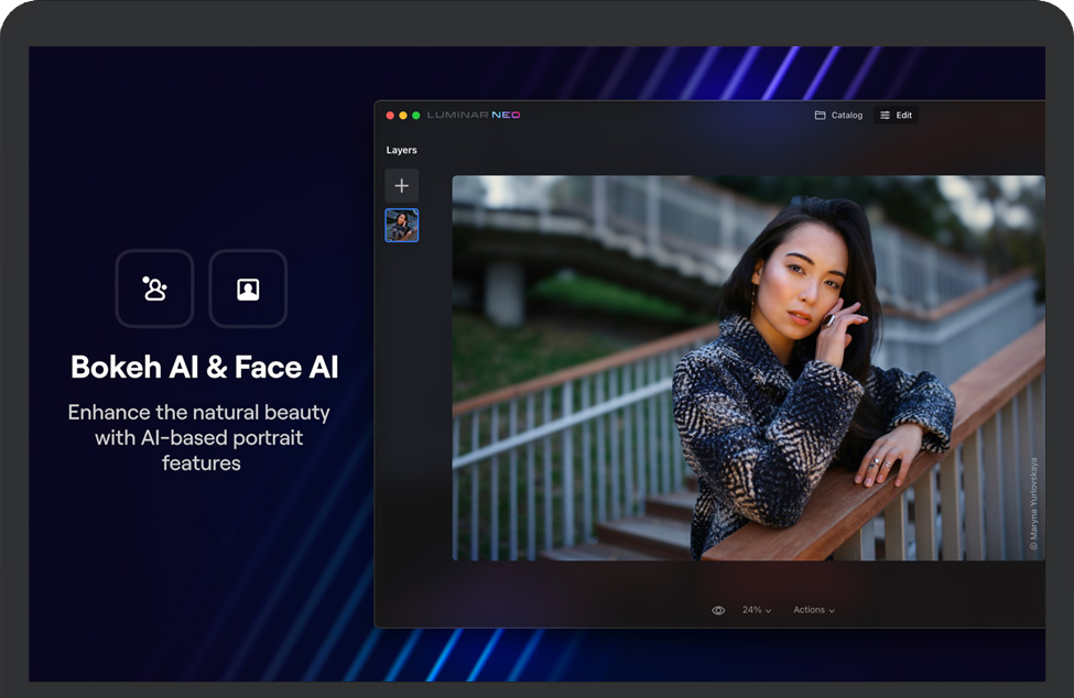 散景是相机镜头渲染失焦物体的方式,从而导致奶油色和朦胧的背景模糊。但是,散景质量取决于相机镜头(例如微距或长焦)、照明条件和摄影师的技能。使用LuminarAI,您不需要任何散景教程或摄影设备:您可以通过人像散景一键获得梦幻般的图像AI工具。