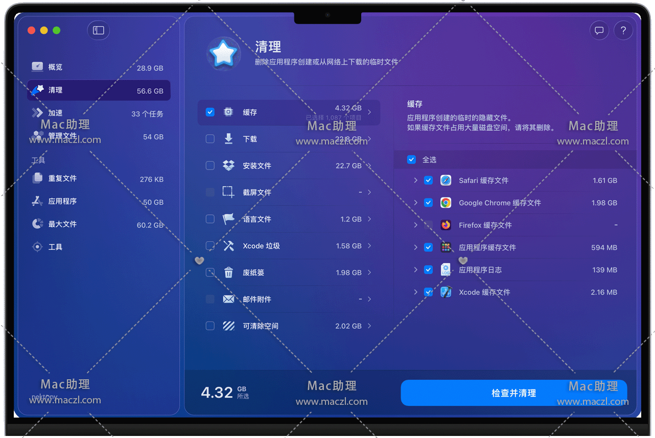 针对性清除 “隐性垃圾”(如邮件附件、本地化文件、旧日志),而非仅清理表面缓存。
