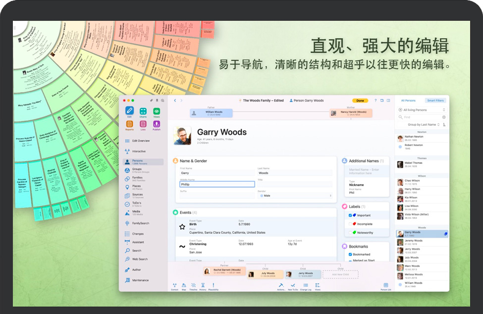 MacFamilyTree 10 for Mac 是一款快速、可靠、流畅的家族族谱制作软件,专为Mac量身定制。MacFamilyTree 专为macOS开发,利用Apple最新操作系统的先进而强大的核心技术。得益于最新的 Apple 技术,尽管有许多动画和交互元素,界面仍然感觉非常流畅。交互式家族树、虚拟树或虚拟地球仪的令人印象深刻的展示只有通过使用 Mac 平台所提供的一切才能实现。几代编年史家梦寐以求的家谱!