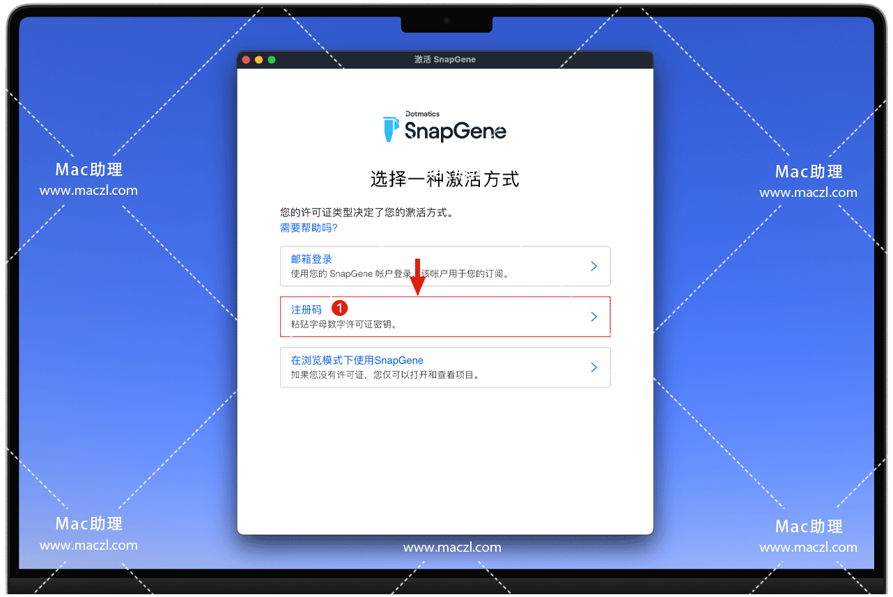 SnapGene】后会弹出 激活 SnapGene 的窗口,如下图,选择注册码(第二个)选项进行后续步骤。