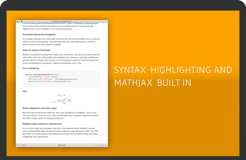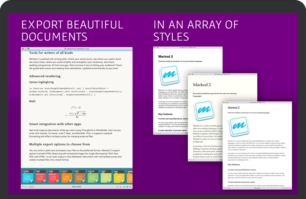 在使用iThoughtsX或MindNode工作时,将思维导图作为文档查看。在使用Ulysses、Scrivener、nvALT、Bear和MarsEdit写作时使用它。此外,它支持Leanpub格式并提供多种语法来合并外部文件。