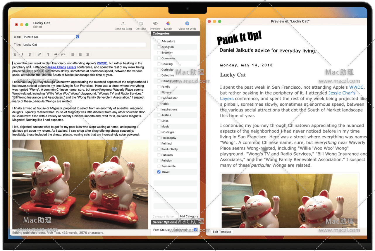 MarsEdit 支持特色图片、文章格式和多作者模式。它甚至支持添加自定义字段,这些字段会直接显示在文章编辑器窗口中。