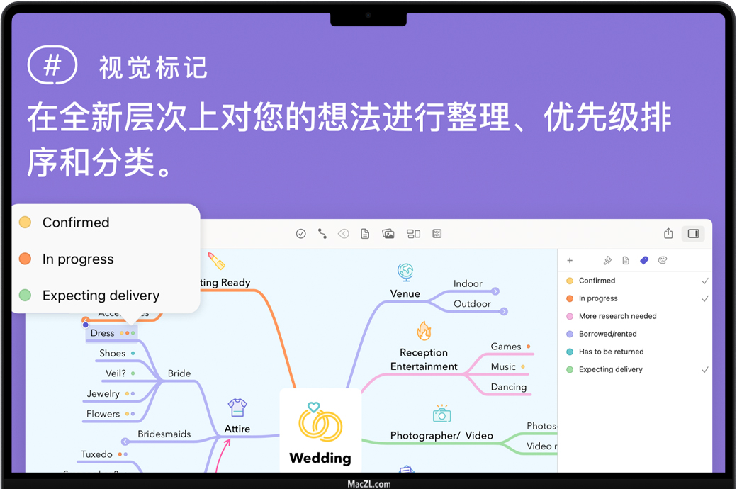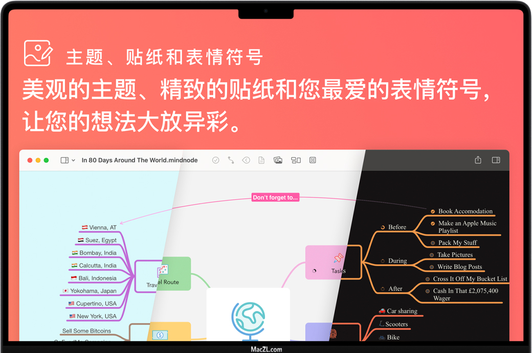 通过精美的现成主题和自定义贴纸为您的文稿添加个性化元素。样式化每个细节,让您的思维导图思路清晰。通过智能布局,您的创意将时刻保持美观。