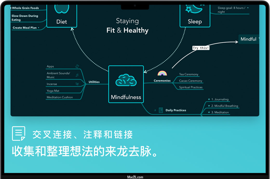 使用 MindNode,通过各种操作捕捉您的想法,例如编辑、重新排列、折叠节点以及导入和导出文件。