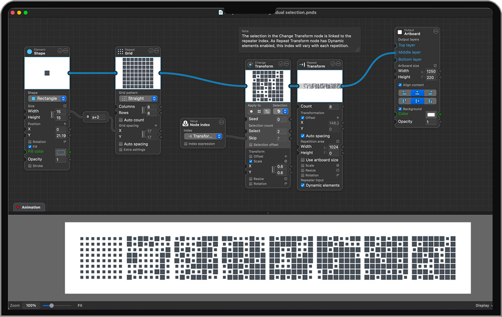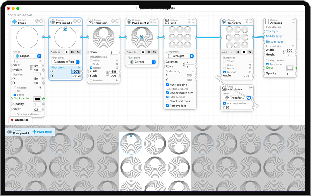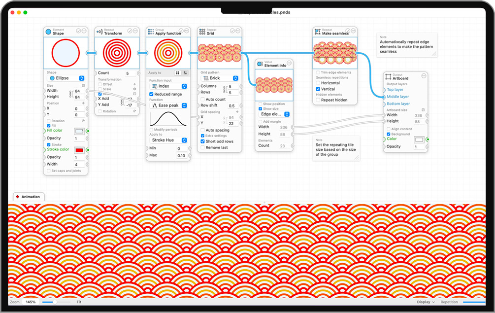 Patternodes是完全无损的,因此您可以随时更改序列中的任何步骤,而无需重做任何事情。这使得调整重复计数或元素属性变得容易,并立即看到最终结果。控制每个节点的参数也可以连接到其他节点,从而建立一个属性控制另一个属性的复杂关系。最后,所有这些节点参数都可以使用时间轴中的关键帧进行动画处理。