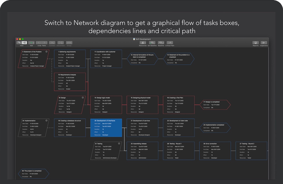 这是任务框、依赖关系线和关键路径的图形流。