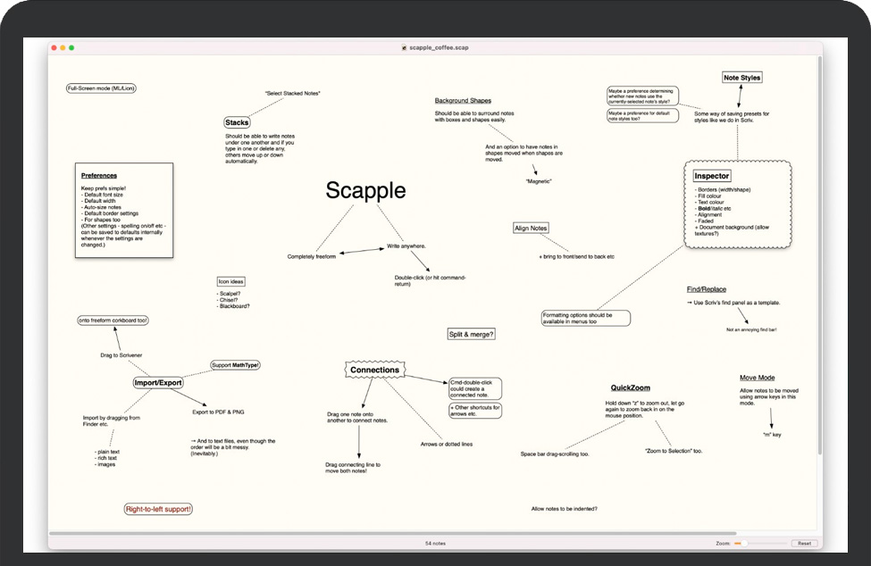 有没有在纸上写下想法并在相关思想之间划清界线?然后,您已经知道Scapple的功能。这是一张虚拟的纸,可以让您在任何地方做笔记,并使用线条或箭头将它们连接起来。