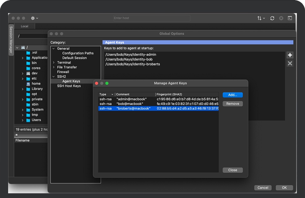 可以使用工具菜单上的管理代理密钥添加和删除密钥。可以指定密钥以在 SecureFX 启动时预加载到 SSH2 代理中。