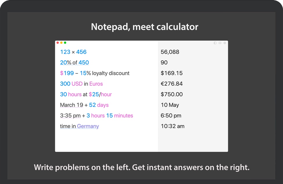 在多行的计算算式中,可以如同试算表一般灵活引用数据,加总计算、百分比计算,对于Soulver都只是小菜一碟。不仅如此,诸如货币之类的单位转换也是Soulver的拿手绝活,效率完胜试算表,更远比传统计算器来得智能。