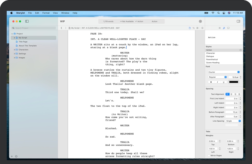 - 制作可提交的手稿和剧本。Storyist提供了一个富文本编辑器,该文本编辑器支持注释,图像,页眉,页脚和样式表,因此您可以创建格式正确的手稿和剧本。Storyist附带手稿和剧本模板,因此您可以专注于写作,而不是格式。