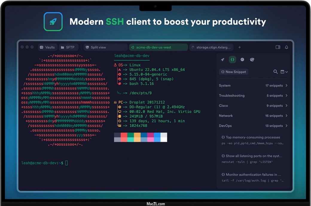 Termius for Mac 不仅仅是一个 SSH 客户端;Termius还是一个完整的命令行解决方案,为系统管理员和网络工程师重新定义远程访问。安全地访问 Linux 或 IoT 设备,并在舒适的沙发上通过笔记本电脑或手机快速解决问题。Termius与Mosh兼容,在高延迟、不断变化的连接上提供出色的可靠性。无需再浪费时间搜索并重新输入 IP 地址、端口、用户名和密码。只需单击一下即可连接到远程设备。