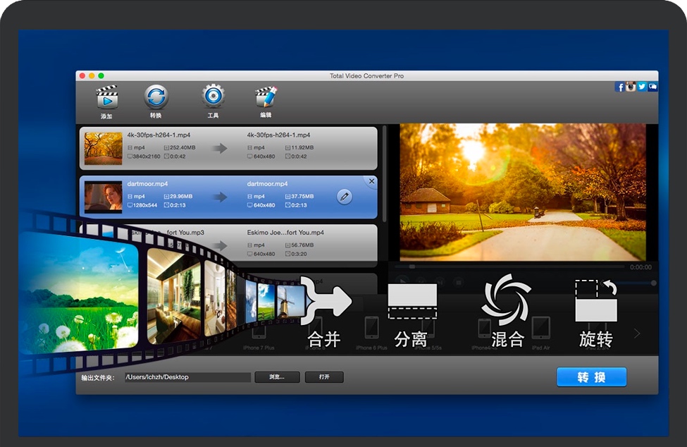 Total Video Converter Pro高级版本,是一个非常强大,全功能的转换器,视频编辑器和DVD刻录机,支持几乎所有的视频和音频格式。 主要特点:批量转换视频和音频文件到iPhone, iPad, iTunes, PS Vita, iMovie, Final Cut Pro。 高速刻录标清SD和高清HD视频到NTSC / PAL制式的DVD。 整合录屏软件,支持录制屏幕并输出无损视频。 提供直观交互的时间线编辑所有视频格式。 逐帧精确裁剪和剪辑视频和音频文件。 自由给视频添加喜欢的背景音乐。 自动导入DV视频(AVCHD/TOD/MOD),并很容易地转换到iMovie, FCP和其他移动设备。 合并多个视频片段为一个专业好看的电影。 从视频文件中无损提取视频和音频。 从视频文件导出GIF动画图像。 增加特效效果如翻转, 旋转, 灰色, 平滑, 使您的视频与众不同。