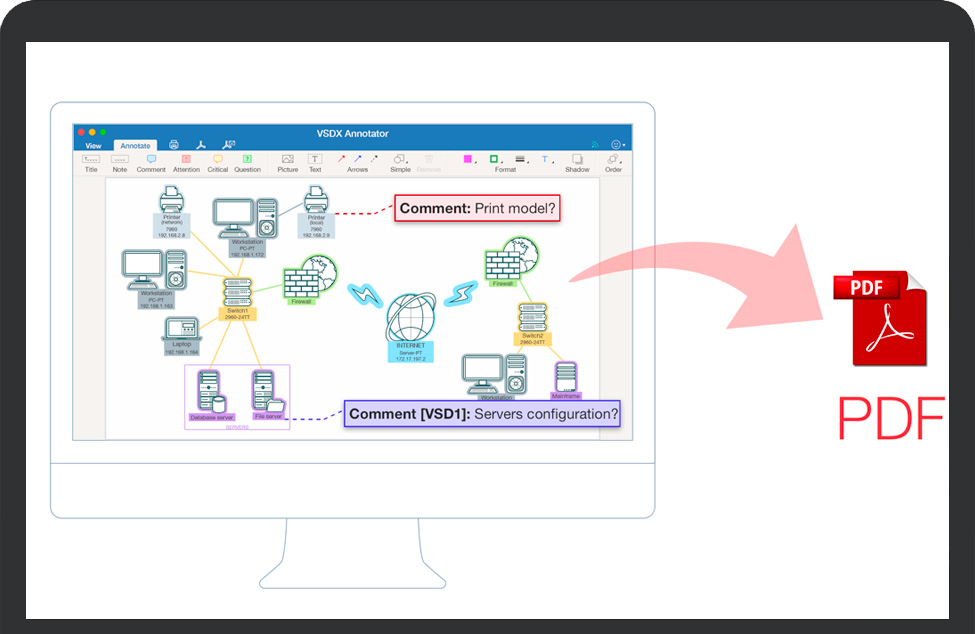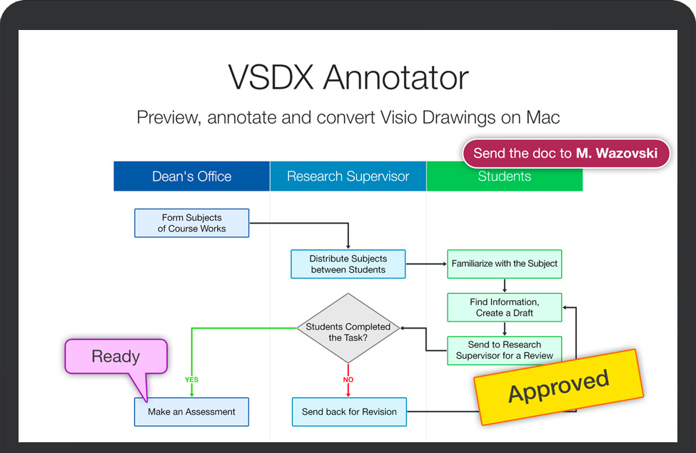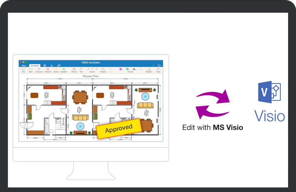 在Mac上打开Visio绘图以VSD/VDX/VSDX文件格式打开和预览任何MS Visio绘图。导航多页文件,查看形状数据、超链接、指南和注释。 | 在Mac上注释Visio文件VSDX Annotator不仅仅是一个文档阅读器,它还提供有用的功能,例如添加注释、流程图和任何图形文件。 | 文件保存为.vsdx或.pdf将修改后的文件保存为 .vsdx 或将它们转换为更常见的 PDF 格式。通过电子邮件以 PDF 格式发送文件或使用菜单栏打印它们。 |