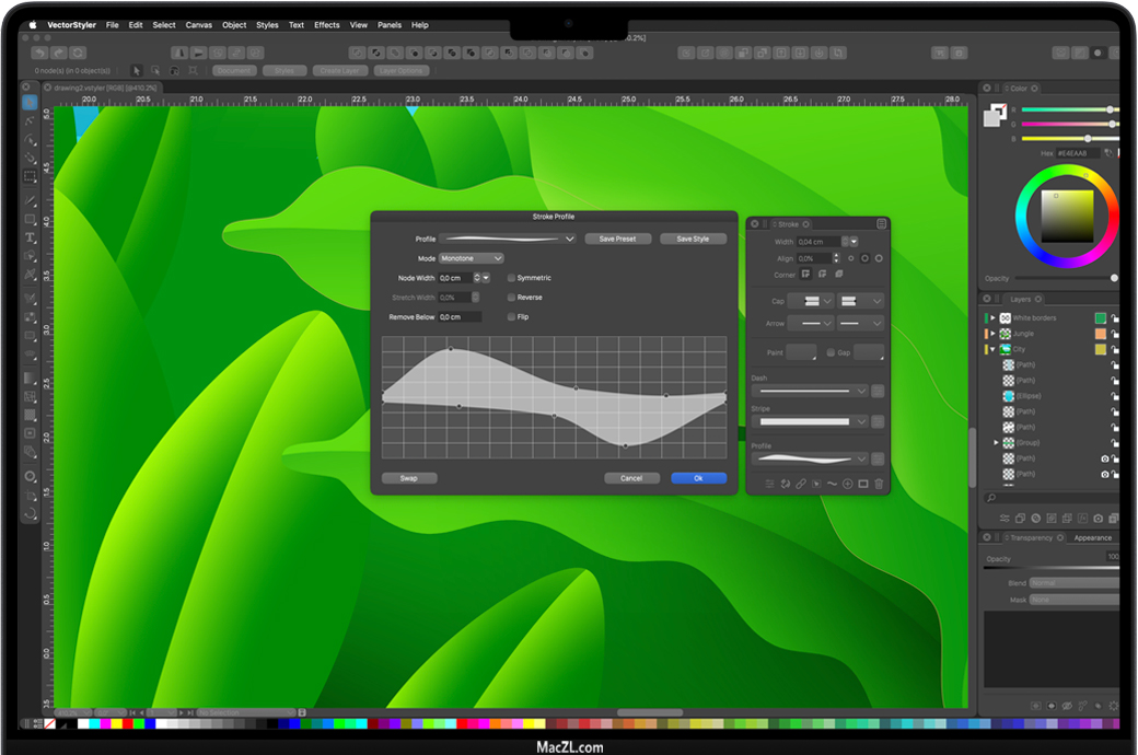 VectorStyler for Mac 是一款先进的插图和矢量图形软件,具有大型新功能集和工作流改进。VectorStyler的开发目标是提供设计师和插图画家熟悉的所有功能,同时引入新的创新功能。为屏幕、印刷品和网页创建插图、徽标、图标、绘图、版式、矢量艺术。在任何形状上放置和编辑文本。路径对齐上的文本可以链接到形状,以便随着形状的更改而动态更新。使用节点工具将点文本的基线拖动到曲线中。路径上的文本可以使用弯曲效果来实现平滑的字形扭曲。