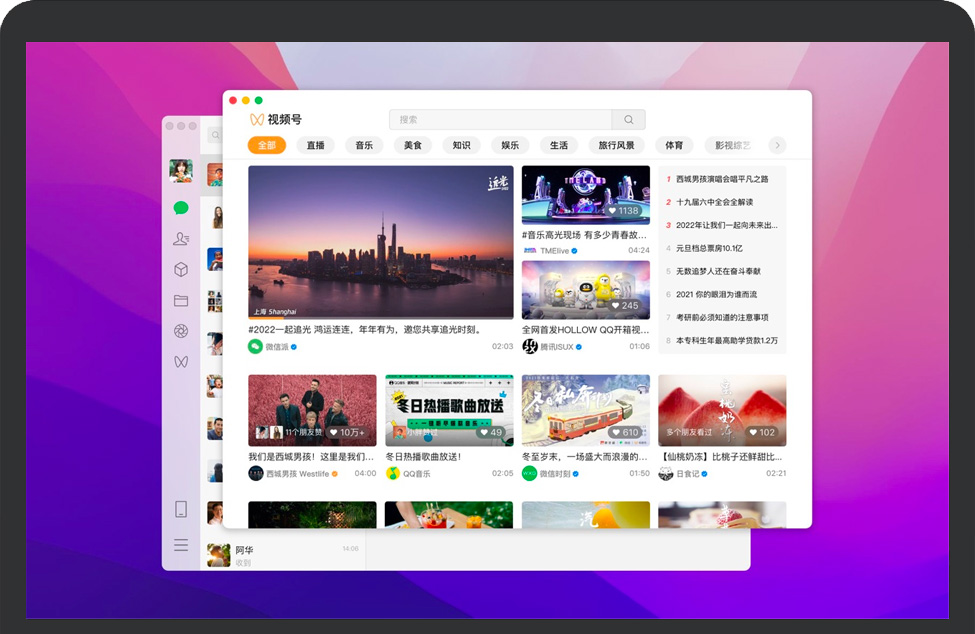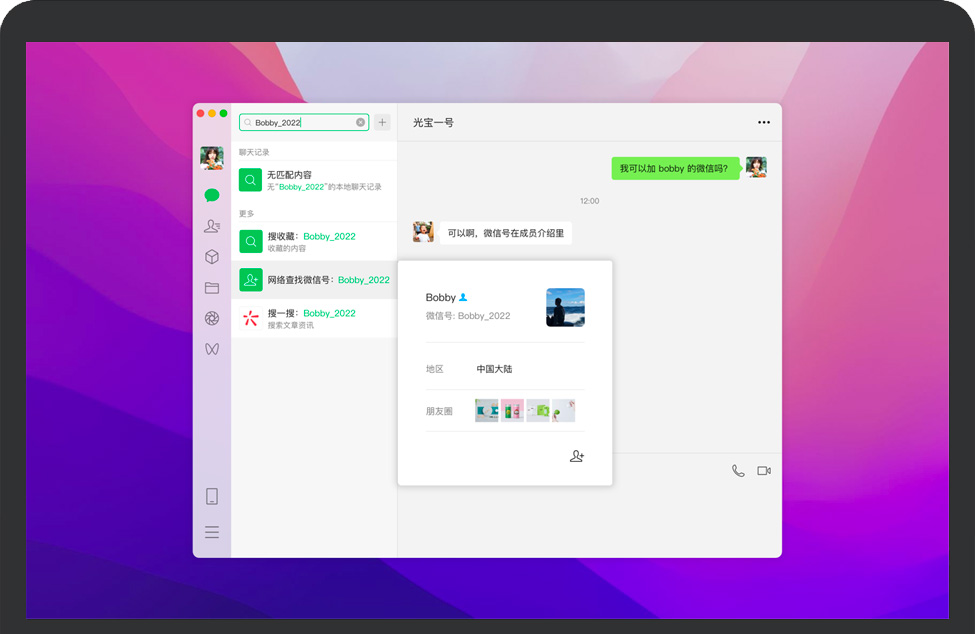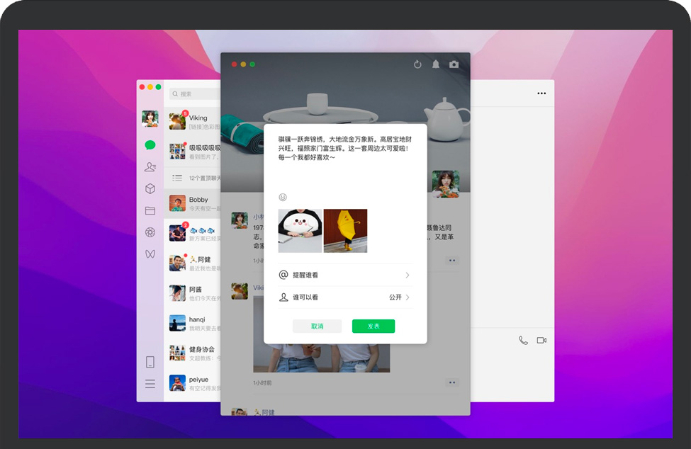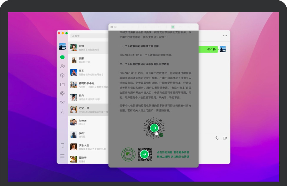 WeChat for Mac 就是我们最常用的微信苹果电脑版,是一个为智能终端提供即时通讯服务的免费应用程序。支持跨通信运营商,跨操作系统平台通过网络快速发送免费(需消耗少量网络流量)语音短信,视频,图片和文字,同时,也可以使用通过共享流媒体内容的资料和基于位置的社交插件“摇一摇”,“漂流瓶”,“朋友圈”,”公众平台“,”语音记事本“等服务插件。