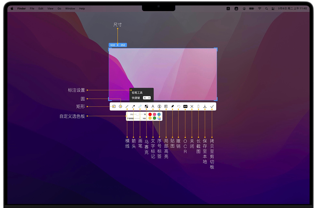 箭头、马赛克等标注工具,提供多款样式选择,让你的标注丰富多彩。