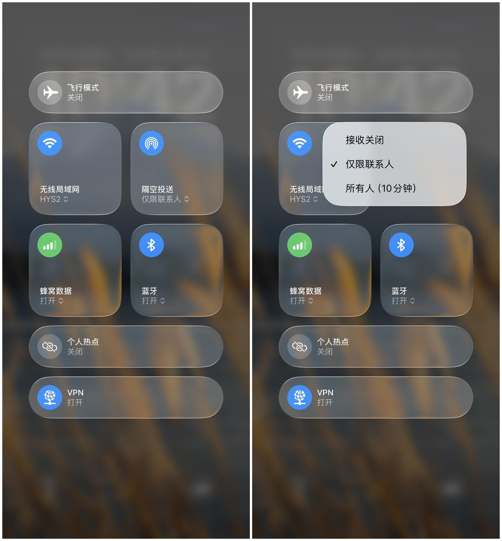 打开「控制中心」,确认「无线局域网」「蓝牙」和「隔空投送」均已开启。如果「隔空投送」处于「接收关闭」或「仅限联系人」状态,可能需要将其更改为「所有人」。