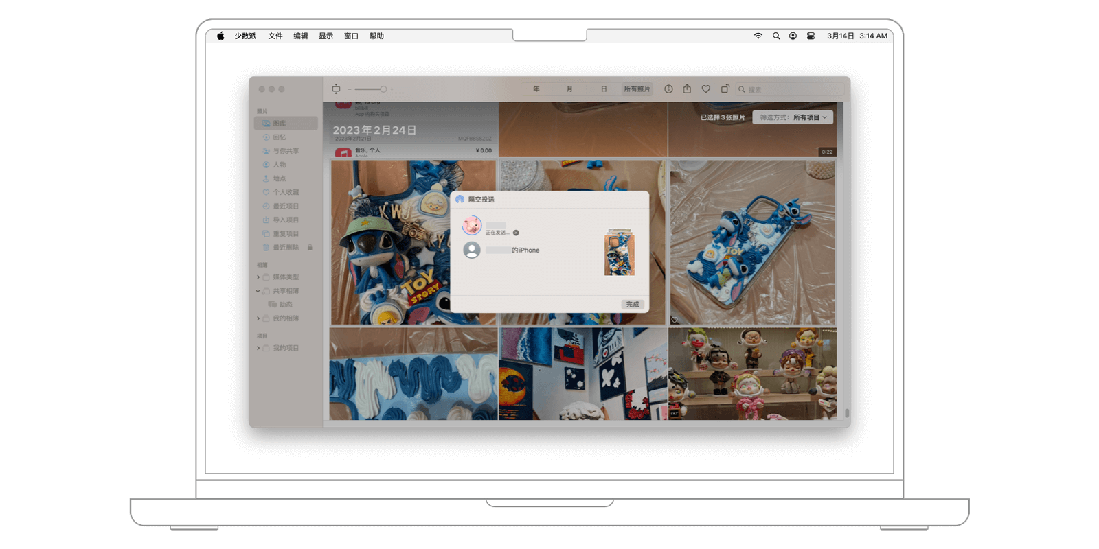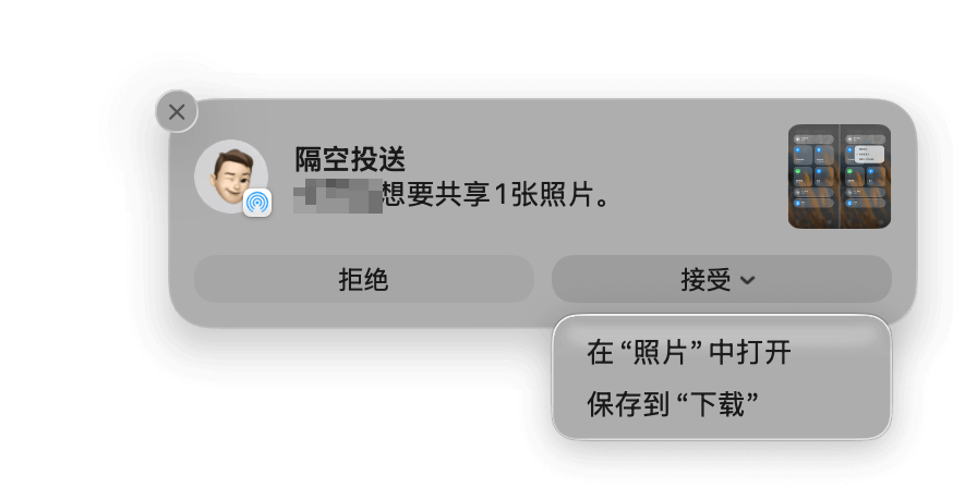 此时,朋友的 Mac 上会弹出一个提示框,显示「XXX 想要共享 X 张照片」,点击「接受」即可开始接收。