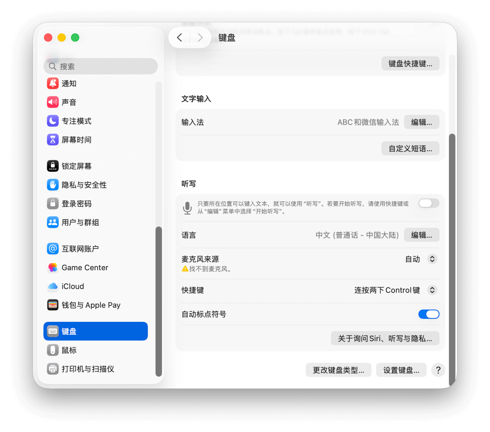 在这里开启「听写」功能后,按下指定的快捷键(默认为连按两次 Fn 键,或在旧款 Mac 上为 F5 键)即可开始语音输入。你也可以在此处自定义听写的语言和快捷键。