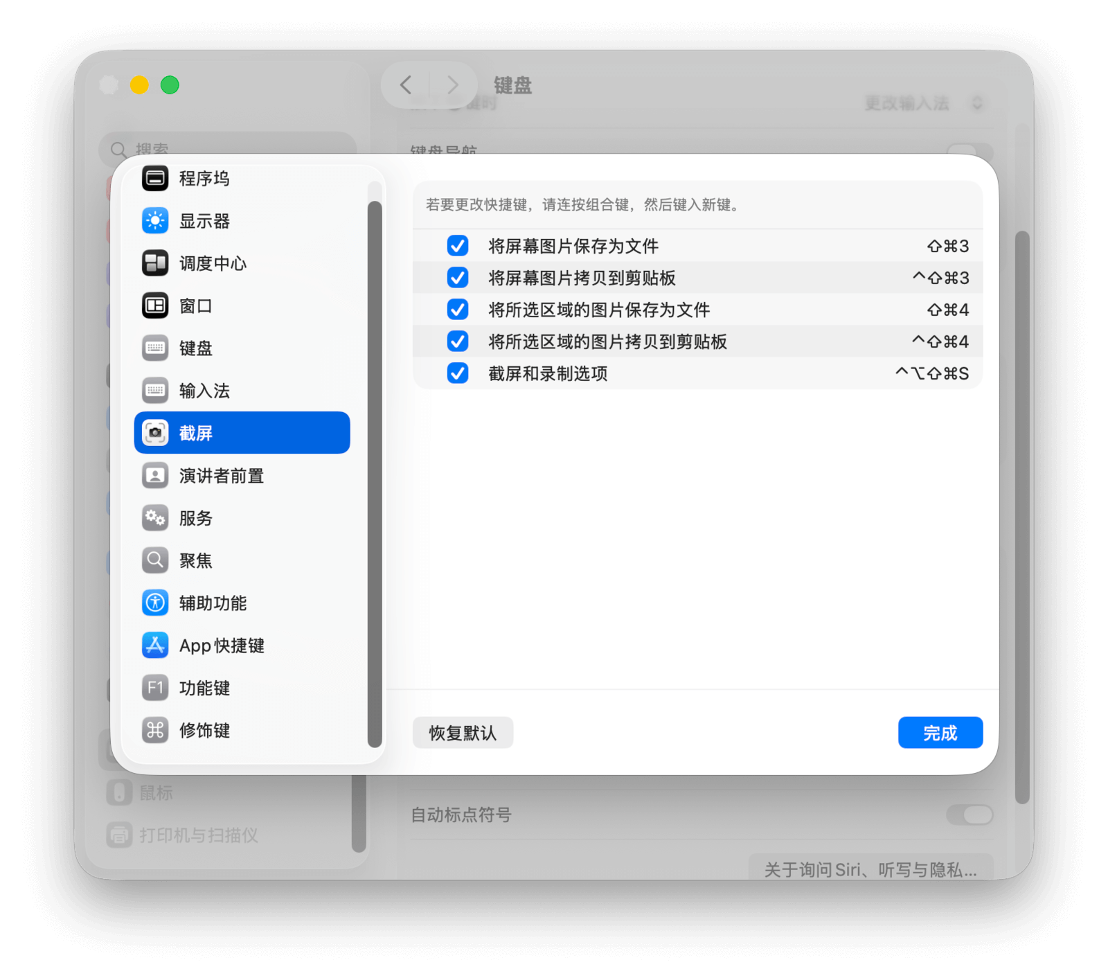 点击右下角的「恢复默认」按钮,可以将所有快捷键恢复为系统初始设置。