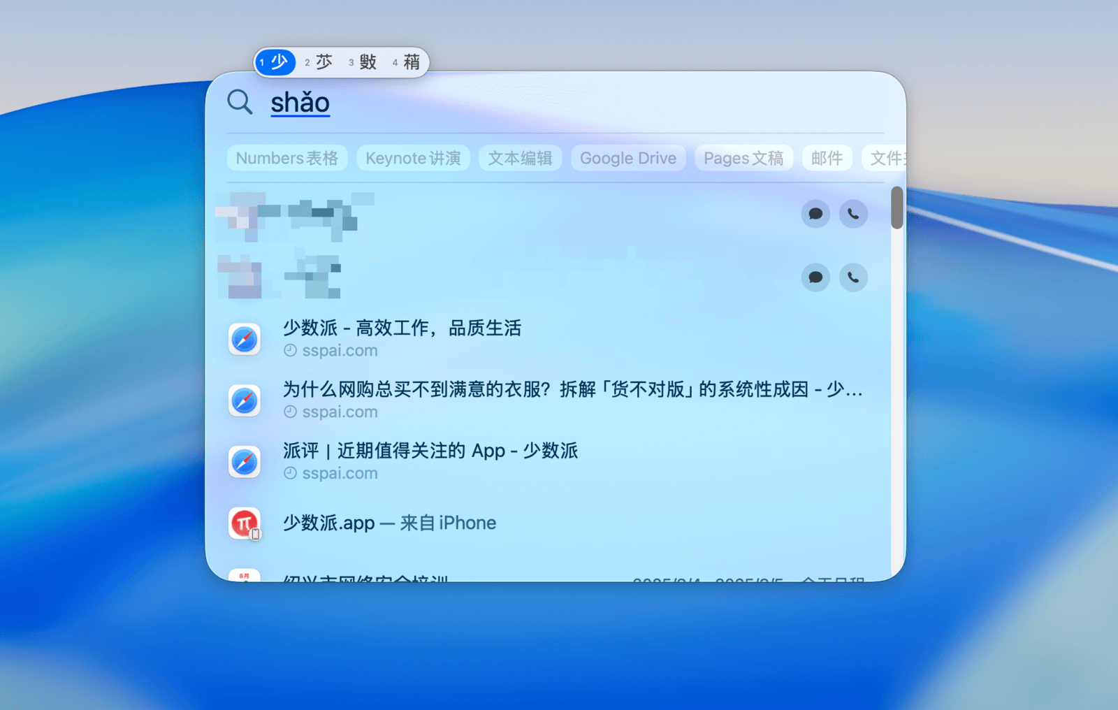在候选词框展开时,可以使用 ⇥Tab 键按部首筛选同音字词。