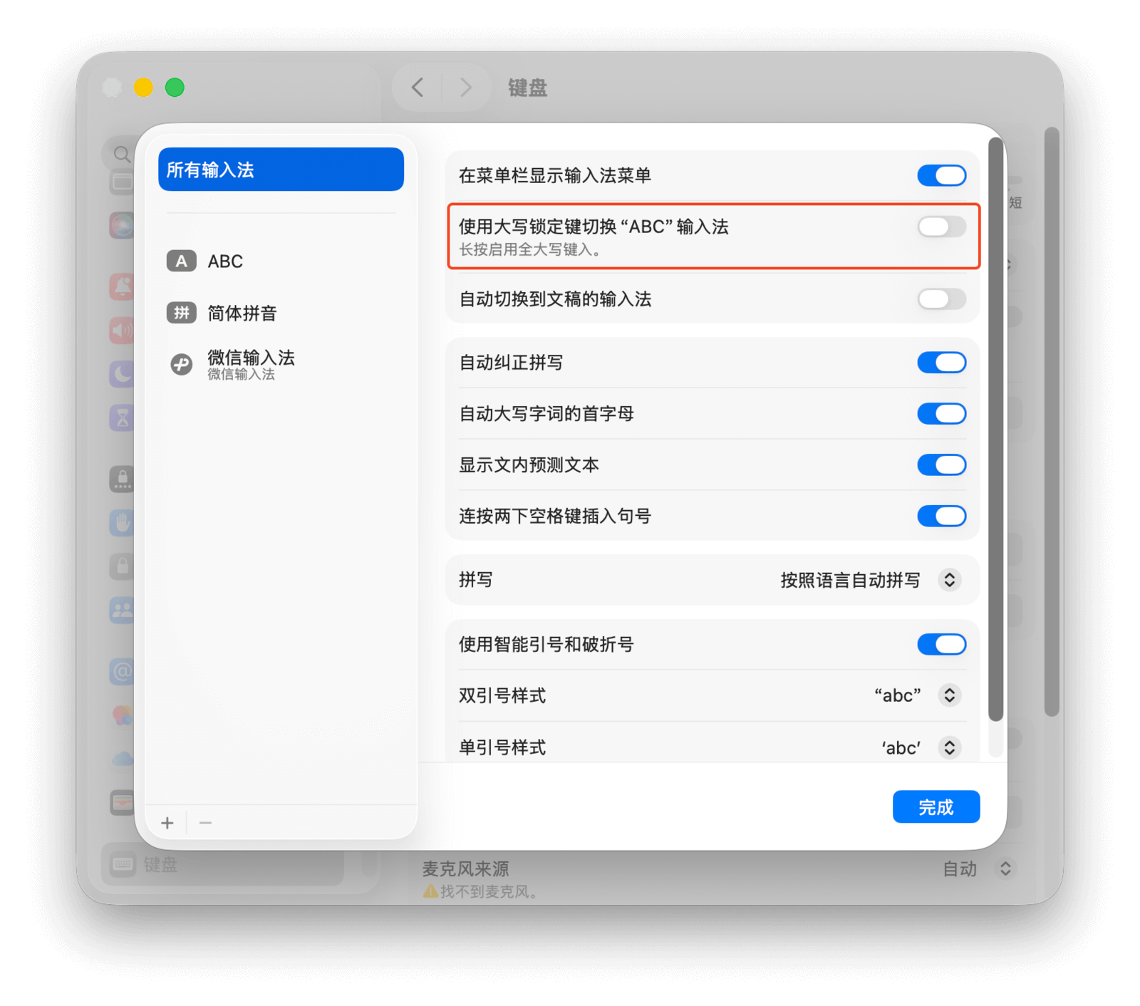 在「系统设置 > 键盘 > 输入法」中,建议勾选「使用“大写锁定”键切换“ABC”输入模式」。启用后,在中文输入状态下,按一下大写锁定键即可切换到英文输入(小写);再按一下则切回中文。若要输入大写英文,可以在英文模式下按住 Shift 键,或长按大写锁定键开启大写锁定。