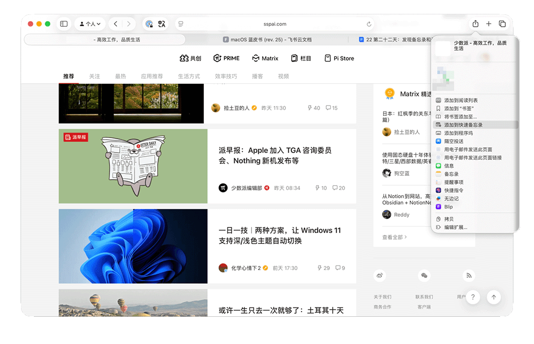 你还可以将 Safari 浏览器中的链接添加到快速备忘录,或是在 Safari 浏览器中高亮显示文本并将其直接添加。