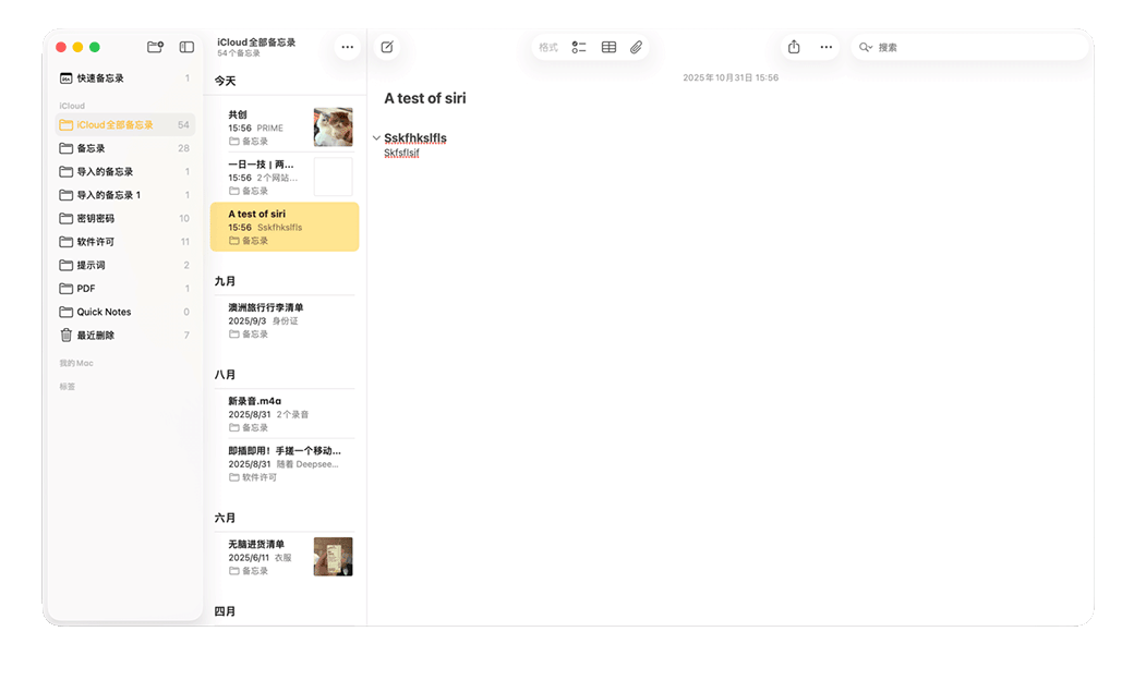 备忘录采用的是富文本编辑器,因此不能通过 Markdown 或类似 Notion 的快捷方式调整文本格式,而是需要像使用 Word 一样,先选中文本,再调整为对应的格式。