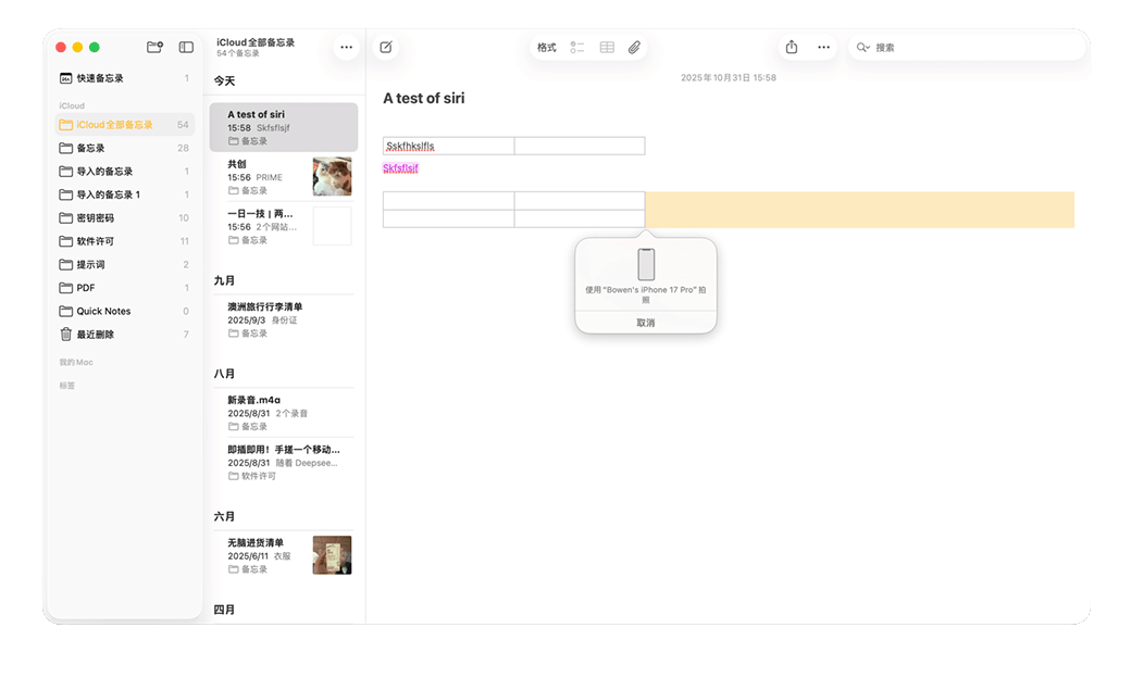 值得一提的是,点选之后,你还可以看到「拍照」「扫描文稿」「添加速绘」三个选项。这三个功能需要基于有拍照、绘制功能的 iOS 设备。如果你有登录了同一 Apple ID 的 iPhone 或 iPad 在旁边,点选之后解锁 iOS 设备便会自动启用相关功能。
