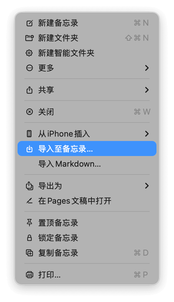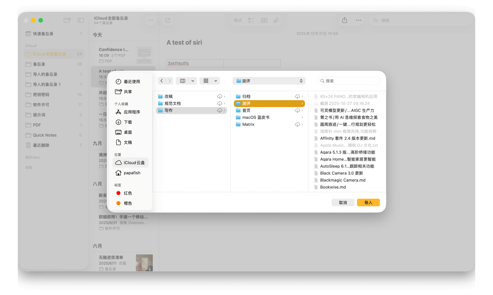 Apple 备忘录还支持导入文本文件,目前支持导入的文件格式有 TXT、RTF、RTFD、HTML、Markdown 以及 Evernote XML Export (ENEX)。