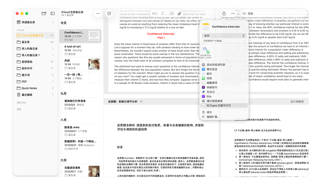 在 macOS Sonoma 中,你还可以将备忘录一键导出到 Pages 文稿。选择任意一个备忘录,点击右上角的分享按钮,然后选择「在 Pages 文稿中打开」,当前的备忘录内容就会直接复制到 Pages 文稿中。